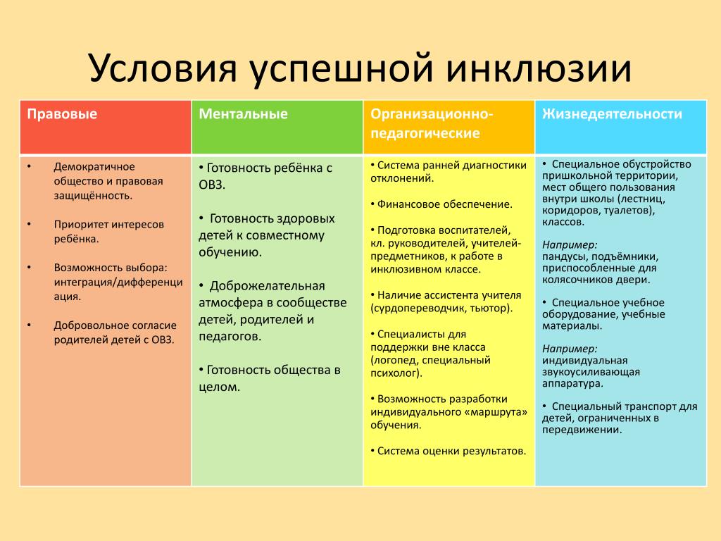 Один из основных аспектов интеграции в образовании – правильно организованные условия обучения для каждого конкретного ребенка. В условиях интеграции ребенок должен быть готов усваивать программу, предназначенную для здоровых сверстников, тогда можно говорить и о готовности к данному процессу как самого ребенка, так и его окружения, т.е. о внешних и о внутренних условиях интеграции.