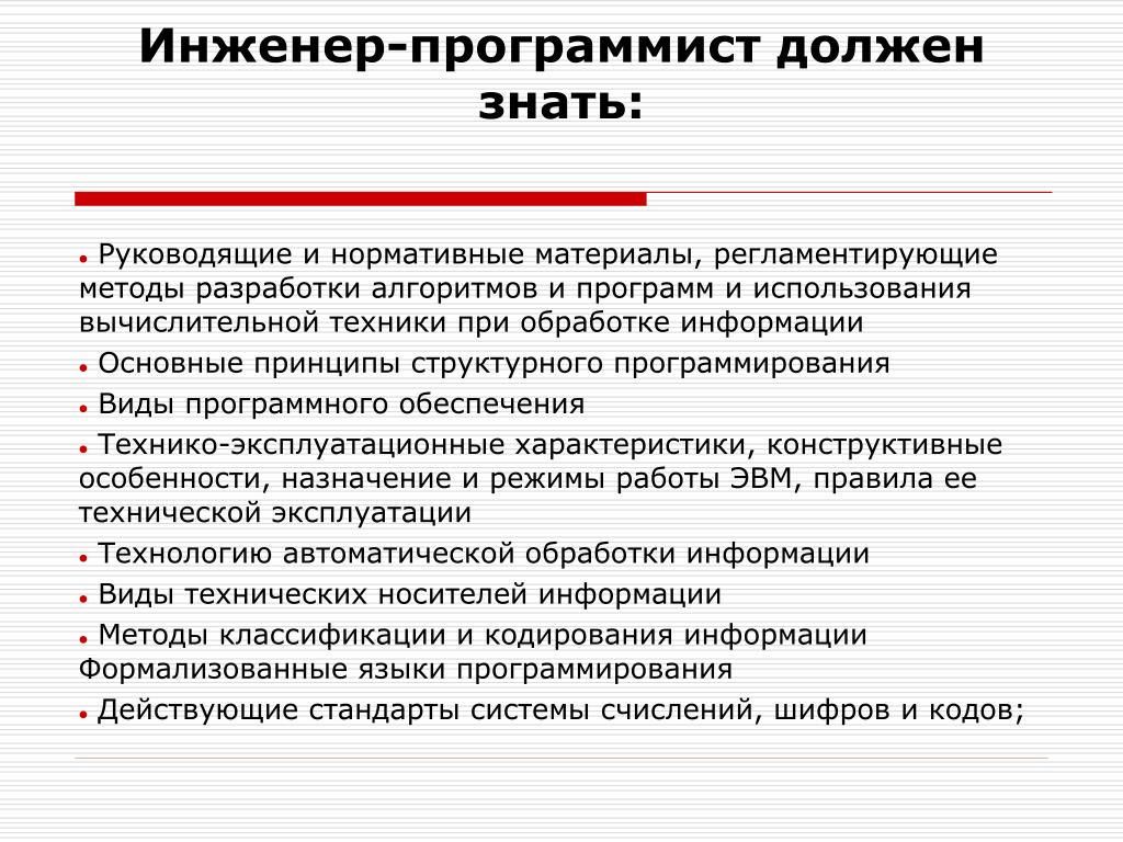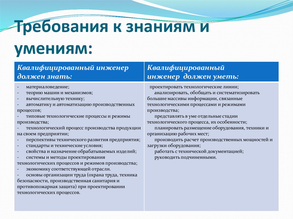 ΠΠ°Π²ΠΈΡΠΈΠΌΠΎ ΠΎΡ ΡΠ»ΠΎΠΆΠ½ΠΎΡΡΠΈ ΠΎΠ±ΡΠ·Π°Π½Π½ΠΎΡΡΠ΅ΠΉ, ΡΡΠ΅Π±ΠΎΠ²Π°Π½ΠΈΡ ΡΠ°Π±ΠΎΡΠΎΠ΄Π°ΡΠ΅Π»Π΅ΠΉ ΠΊ ΠΏΡΠ΅ΡΠ΅Π½Π΄Π΅Π½ΡΠ°ΠΌ ΠΎΡΠ»ΠΈΡΠ°ΡΡΡΡ. ΠΠΎ Π² ΠΎΠ±ΡΠΈΡ ΡΠ΅ΡΡΠ°Ρ ΡΠΎΠ²ΠΏΠ°Π΄Π°Π΅Ρ ΠΏΡΠ΅Π΄ΡΡΠ°Π²Π»Π΅Π½ΠΈΠ΅ ΠΎ ΡΠΎΠΌ, ΡΡΠΎ Π΄ΠΎΠ»ΠΆΠ΅Π½ Π·Π½Π°ΡΡ ΠΈΠ½ΠΆΠ΅Π½Π΅Ρ-ΡΠ»Π΅ΠΊΡΡΠΈΠΊ. Π Π³Π»Π°Π²Π½ΠΎΠ΅ ΡΡΠ΅Π±ΠΎΠ²Π°Π½ΠΈΠ΅ β Π½Π΅ΠΎΠ±Ρ ΠΎΠ΄ΠΈΠΌΠΎΠ΅ Π½Π°Π»ΠΈΡΠΈΠ΅ Π²ΡΡΡΠ΅Π³ΠΎ ΡΠ΅Ρ Π½ΠΈΡΠ΅ΡΠΊΠΎΠ³ΠΎ ΠΎΠ±ΡΠ°Π·ΠΎΠ²Π°Π½ΠΈΡ.