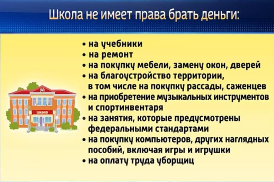 Руководство школ или учителя не вправе требовать или даже просить какой-либо финансовой поддержки на содержание школ и обеспечение образовательного процесса. К этому относятся, например, оплата ремонта, покупка мебели или просьба сдать на охрану.