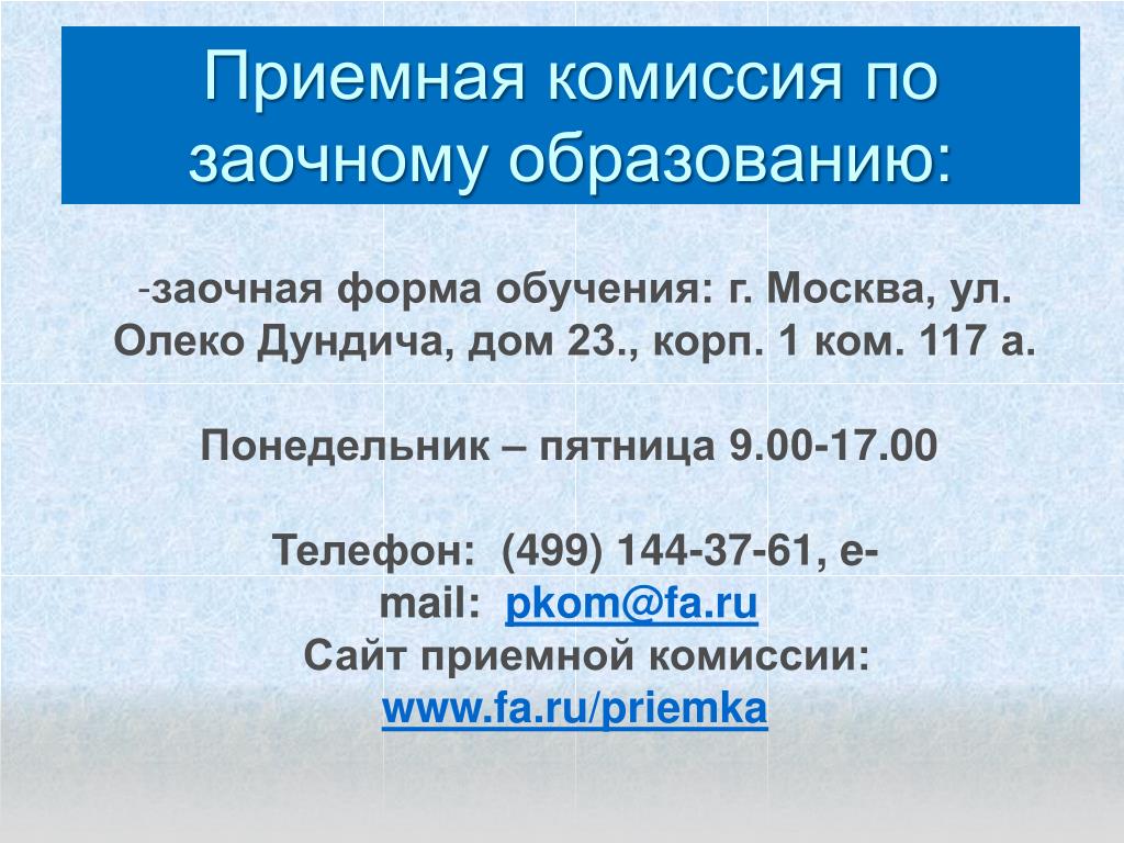 Финансовый университет при Правительстве РФ, Приемная комиссия заочного отделения 121096, Московская область, Москва, Фили-Давыдково район, Олеко Дундича, 23