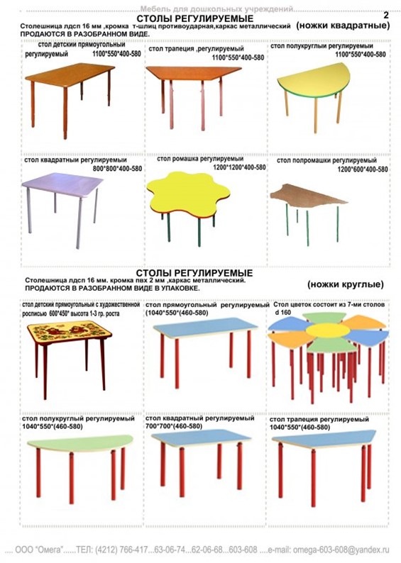 Документ разделяет детские столы на 5 типов: четырехместный, двухместный с ящиками и без ящиков, двухместный трапециевидной формы (дополнительный), а также одноместный и с регулируемыми параметрами.