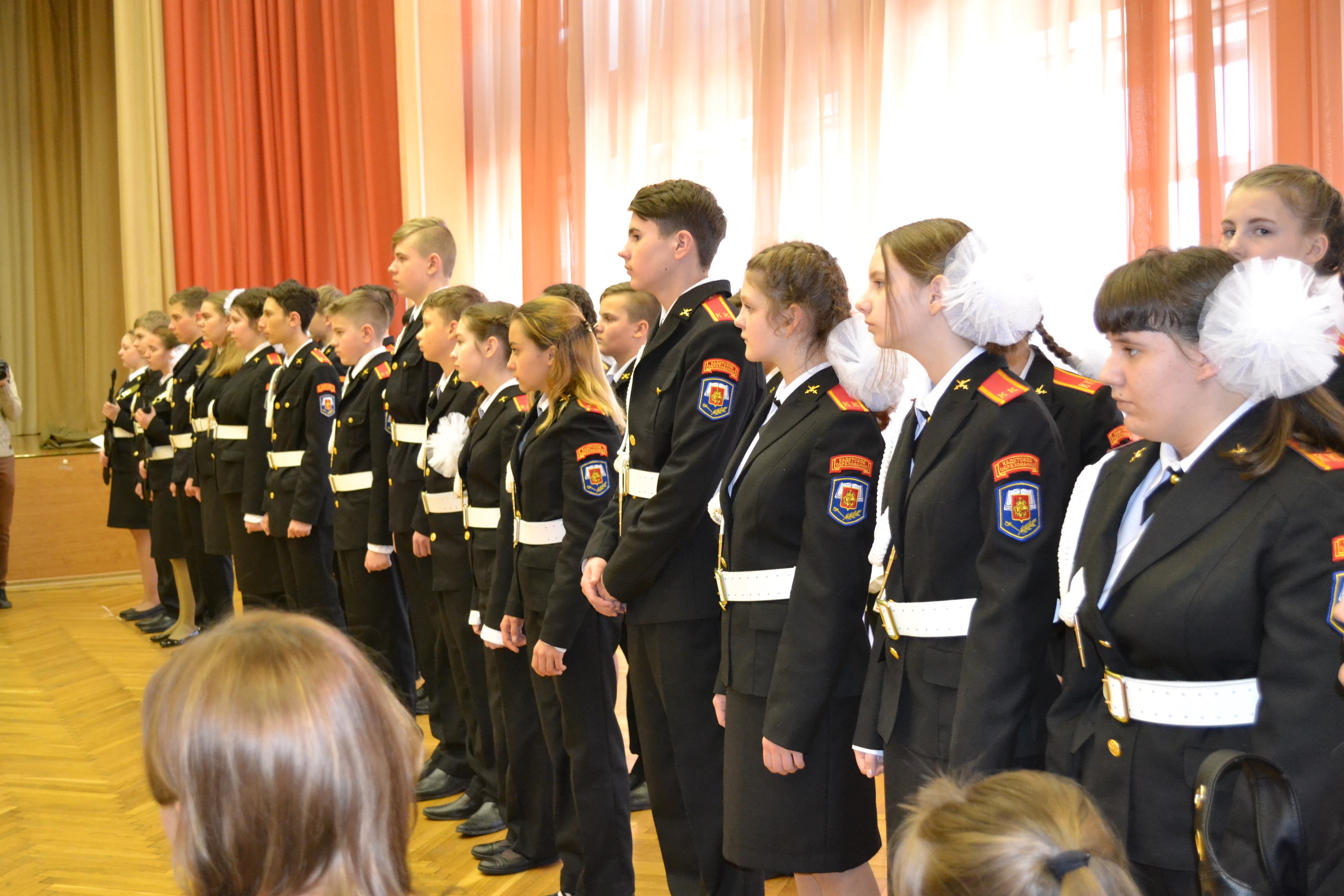 В парадной форме,  оранжевых беретах и белых перчатках  нарядные и важные первоклашки  ровным строем вошли в актовый зал. Отныне эти ребята – не просто учащиеся первых классов, теперь они гордо именуются “кадетами”. 1