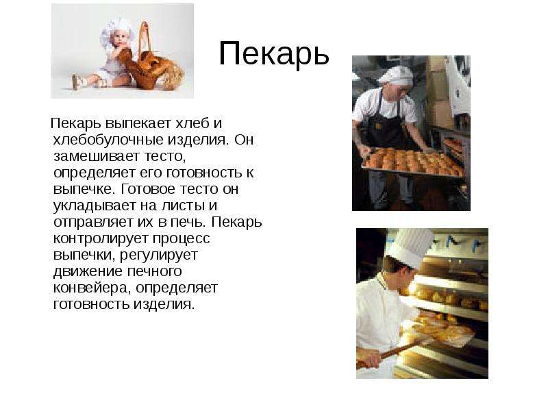 В изготовлении хлеба и его появлении на нашем столе участвует много людей самых разных профессий. Прежде всего, с хлебом связана профессия ПЕКАРЯ. С того времени как человек научился выпекать хлеб, технология его производства значительно изменилась, однако профессия пекаря по-прежнему осталась уважаемой и востребованной. Пекарь выпекает различные виды хлеба и полуфабрикаты для кондитерских изделий.