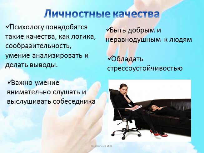 Необходимых качеств не так уж много; всё остальное – профессиональные навыки, которым и можно с большим или меньшим трудом овладеть. Сами психологи полагают, что профессионалам необходимы интерес и уважение к Человеку (да, именно с большой буквы). Им искренне интересно, как устроен внутренний мир человека, они искренне хотят разобраться в хитросплетениях человеческой психики. Эдакое здоровое любопытство: а как же он устроен, человек? Такой интерес мало поддается развитию: либо он есть, либо его нет. Другими словами: есть ли в вас человеколюбие, дружелюбны ли вы? Еще одно важное качество – толерантность. Это терпимость к другому, иному, готовность принимать разные человеческие проявления без агрессии и раздражения. Такое качество уже, пожалуй, больше поддается развитию, но всё же, если оно уже есть как данность, будет проще. Третье – это гибкость, открытость изменениям. Если вы легко приспосабливаетесь к новым условиям, умеете признавать свои ошибки и быстро изменять свое поведение, то вы обладаете одним из профессионально важных для психолога качеств.