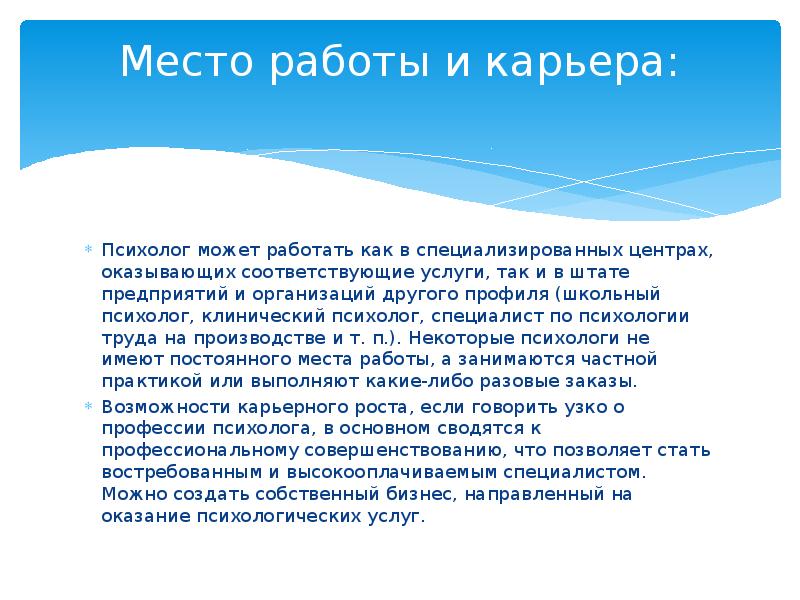 Психологи могут заниматься научными исследованиями, преподавать или работать в прикладной области. В последнем случае их называют практическими психологами. Сфера их деятельности обширна: это учебные заведения, крупные предприятия, органы внутренних дел, бизнес, МЧС, клиники…