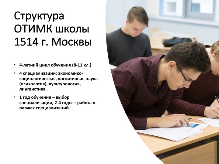 ОбучениеПрограмма:5-7 кл. — усиленная программа по почти всем предметам, есть “авторский” курс “Окружающий мир” (основы естественных наук), 6-7 классы — “Латинский язык и античная культура”. С 8 класса — три профиля: математический (математика с мат.анализом, физика, информатика), естественнонаучный (химия, физика, биология, география), гуманитарный (литература, русский язык, история и обществознание, история искусства, 2 иностранных языка). С 9 класса — культурологический класс – экспериментальная площадка (курсы истории культуры, истории искусства, латинский, древнегреческий, французский и немецкий языки, высокий уровень физики, математики и информатики). В профильных классах предметы изучаются на уровне первых курсов соответствующих вузов.