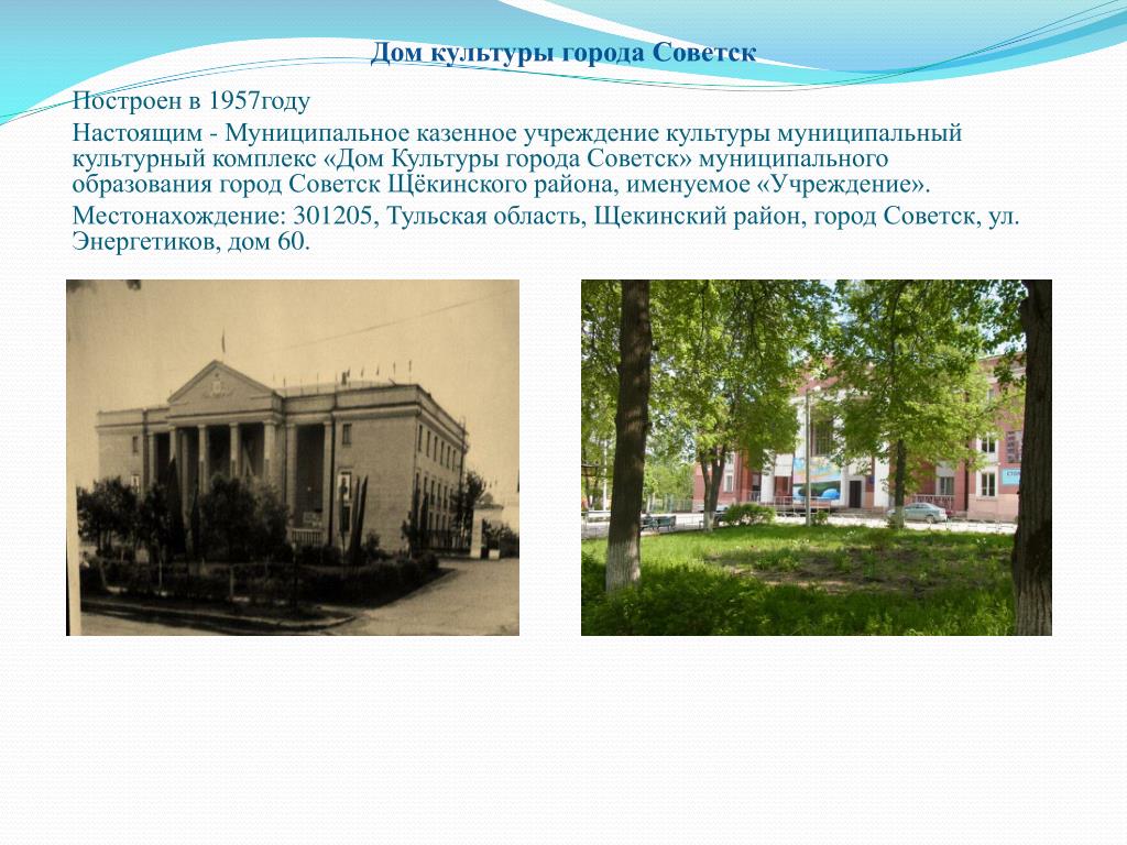 301205, Тульская область, Щекинский район, г. Советск, ул. Школьная, д. 2