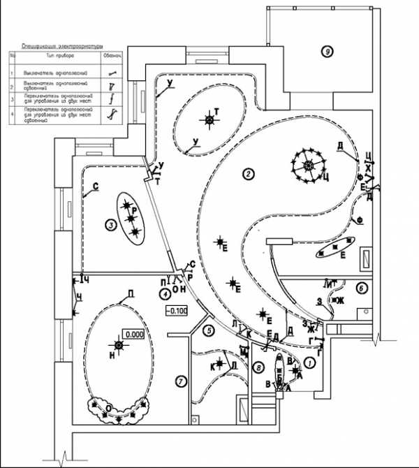 На плане освещения указывается какой выключатель что включает. Особенно важно для помещений с многоуровневым освещением.