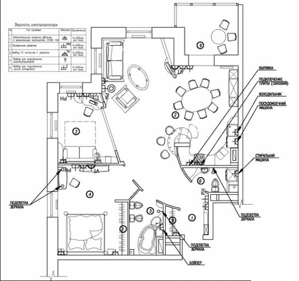 Это места расположения розеток, электровыводов и выключателей, с указанием высот и предназначения. (Например: на кухне электровывод для вытяжки, розетка для духового шкафа и т.п.)
