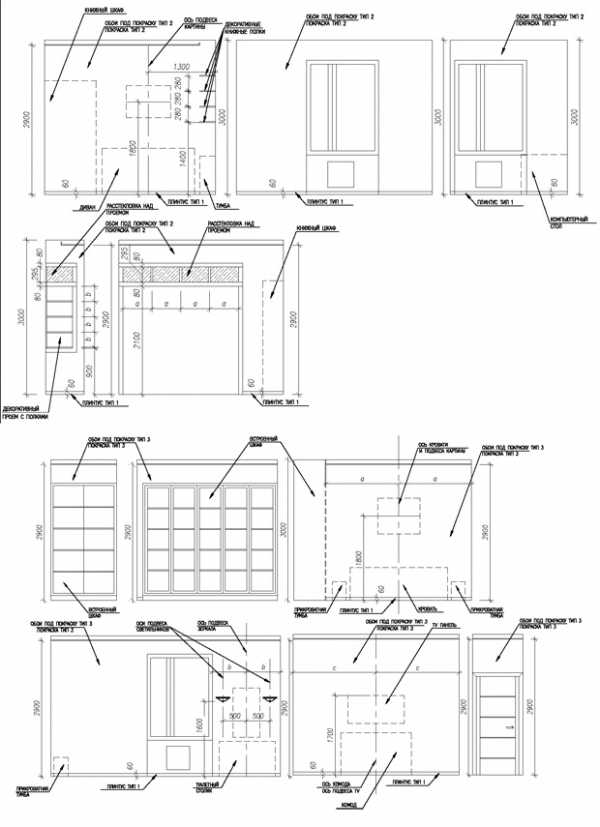 На этих чертежах показываются декоративные перегородки, ниши, подсветки, расположение мебели вдоль стен, т.е. то, что невозможно увидеть на планах сверху.