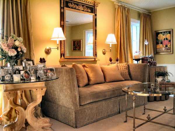 На потолке должна красоваться большая люстра из хрусталя. В комнате можно установить канделябры, подсвечники, кованные из железа. Стены украшаются картинами, написанными на холсте, портретами в массивных золоченых рамах. Дополнят интерьер бронзовые статуэтки. Если есть возможность, также устанавливают колонны и арки.