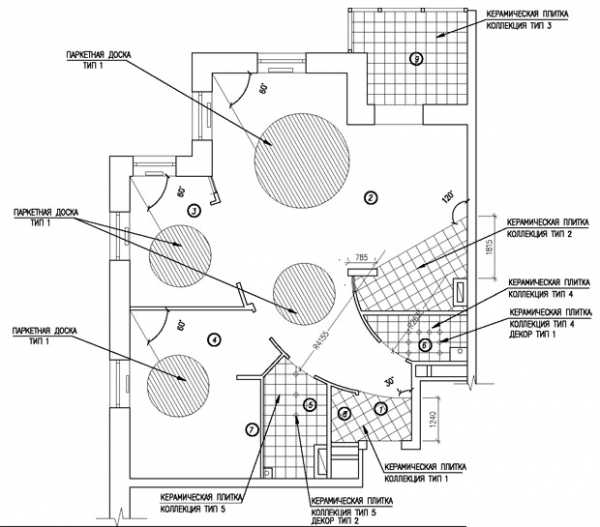 На плане после реконструкции показано в каких помещениях какое напольное покрытие (например: в кухне – керамическая плитка, в гостиной – массивная доска и т.п.), начало раскладки, высота подиумов (если они есть), линии стыковок различных видов напольных покрытий (например: керамогранита и паркета).